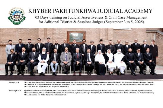 Peshawar, September 5, 2025 – The Khyber Pakhtunkhwa Judicial Academy (KPJA) successfully concluded a 3-day training on Judicial Assertiveness and Civil Case Management for Additional District & Sessions Judges (AD&SJs), held from 3rd to 5th September 2025 at the Academy in Peshawar.