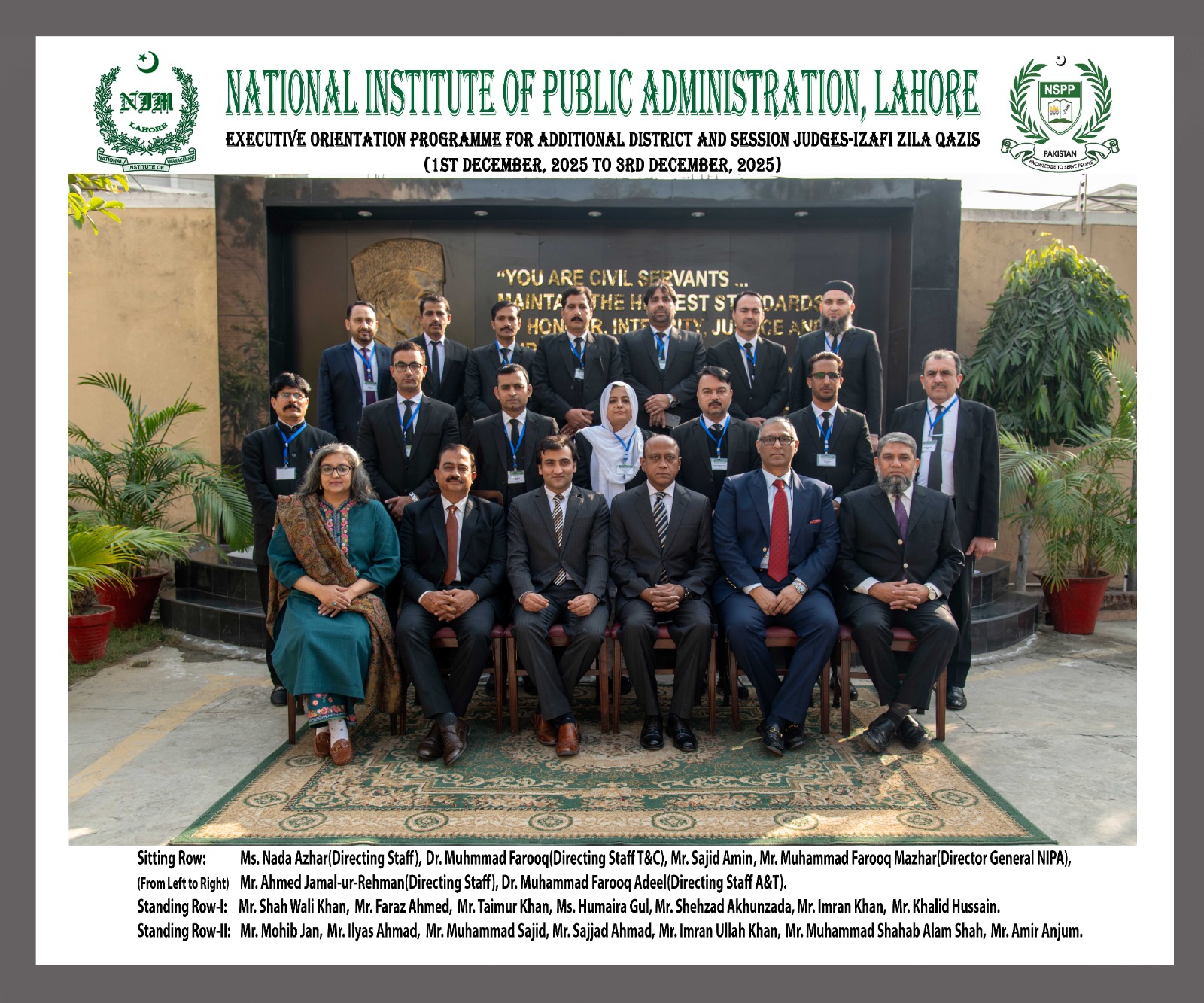 As part of the 08 Weeks Pre-Service Training for Additional District & Sessions Judges / Izafi Zilla Qazis, the trainee judicial officers of the Khyber Pakhtunkhwa Judicial Academy attended a three-day Executive Orientation Programme at the National Institute of Public Administration (NIPA), Lahore from 1–3 December 2025.