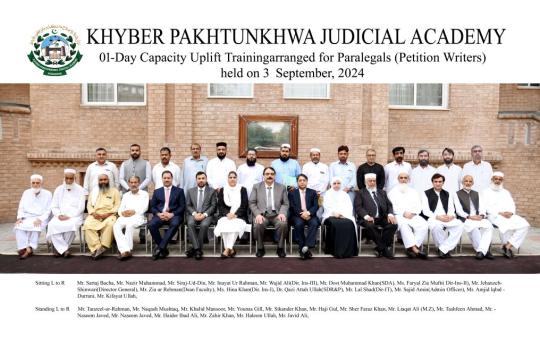 The Khyber Pakhtunkhwa Judicial Academy organized one-day training under Justice Sector Reforms: (Capacity Uplift of Paralegals). 20 Petition Writers and Deed Writers from District Charsadda, Peshawar and Mardan participated in the training activity.