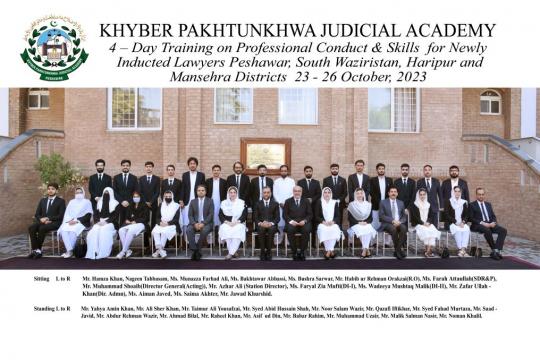 Khyber Pakhtunkhwa Judicial Academy concluded the training for newly inducted lawyers from four districts of Khyber Pakhtunkhwa on 26 th October, 2023. The final day included discourses on Alternative Dispute Resolution and Role and Responsibilities of Lawyers in Islam & towards Protection of Institution of Family. Concluding ceremony was chaired by Mr. Muhammad Shoaib, Director General (Acting) of the Academy & all the Directors attended the ceremony. Mr. Ahmed Bilal, Advocate, Class Representative appreciated efforts of the Academy for training activity focused on professional refinement of lawyers. He recommended that topics on Relevancy & Admissibility of Evidence and Legal Research for lawyers may be also included in future trainings. He expressed gratitude to the Academy for the training and hospitality they were provided. Later, participation certificates were conferred to the participants.