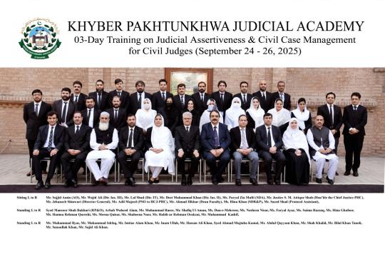 Peshawar, September 26, 2025 — The Khyber Pakhtunkhwa Judicial Academy (KPJA) successfully concluded a 3-Day Training on Judicial Assertiveness & Civil Case Management for Civil Judges, held from 24–26 September 2025 at the Academy’s campus in Peshawar.