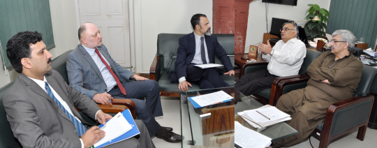 A UNDP delegation comprising of Mr. Ignacio Artaza, Country director; Jakhongir Khaydarv, Head of Sub office KP and Mr Ijaz visited the KP Judicial Academy on 19.04.2017. The KP Judicial Academy was represented by the worthy Director General, Mr. Masood Khan, learned Dean Faculty , Khawaja Wajihuddin, Sr. Director Administration, Mr. Asif Khan and Sr. Director R&P, Mr. Sohail Noor Sani. The delegation was briefed on the regular training programmes conducted by the KP Judicial Academy, with UNDP support for strengthening of the province’s Judicial system. The UNDP delegation discussed matters of mutual interest and long-term future prospects for cooperation with the KPJA. The delegation also visited various sections of the Academy including, the Research Wing, Library and Radio Meezan studios. The delegation appreciated the academic achievements and research studies conducted by the academy and also expressed immense pleasure on the progress made by KPJA in very short span of time.