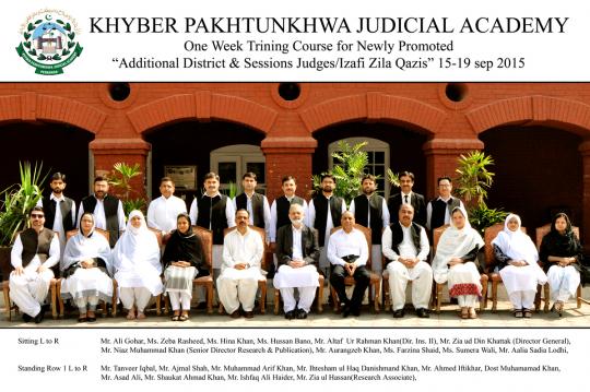 A total of three weeks training is prescribed for new promotees to the post of Additional District & Sessions Judges (AD&SJs). (PHC Notification No. 5-J dated Peshawar the 20th December, 2003, Judicial Estacode p.216). The Academy, for the first time in its history, organized one week training (Sep 15-19, 2015) for the recently promoted AD&SJs. Two further week long trainings would be followed in the month of November and December this year. A total of 16 male and female judges participated in this course. They are Mr. Aurangzeb Khan, Ms. Farzina Shaid, Mr. Ahmad Iftikhar, Mr. Ishfaq Ali Haider, Ms. Aalia Sadia Lodhi, Mr. Ihtesham ul Haq, Ms. Sumera Wali, Mr. Tanveer Iqbal, Mr. Muhammad Arif Khan, Mr. Ajmal Shah, Mr. Ali Gohar, Mr. Shaukat Ahmad Khan, Ms. Zeba Rasheed, Mr. Asad Ali, Mr. Dost Muhammad Khan, and Ms. Hina Khan.
