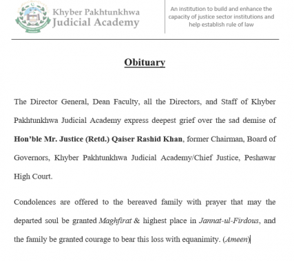 The Director General, Dean Faculty, all the Directors, and Staff of Khyber Pakhtunkhwa Judicial Academy express deepest grief over the sad demise of Hon’ble Mr. Justice (Retd.) Qaiser Rashid Khan, former Chairman, Board of Governors, Khyber Pakhtunkhwa Judicial Academy/Chief Justice, Peshawar High Court.