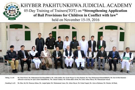 This training was conducted from 15 to 19 November, 2016 at KP Judicial Academy with the support of UNICEF. 16 participants including Judicial Officers, Lawyers, Probation Officers and Police Officers participated in the course. The Concluding ceremony of ToT on “Strengthening of Application of Bail Provisions for Children in Conflict with the Law” was held at Judicial Academy on 19 November, 2016.
