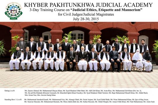 The first training of its kind on the all important topic of “judicial ethics, etiquette and mannerism” got concluded in the Academy on July 30, 2015. The training had started on July 28 (2015). The participants of this programme were civil judges and judicial magistrates from different parts of the province. The training sessions included topics on ethics in general, judicial ethics, international standards, case law and code of conduct for judges. The participants took keen interest in each session. A practical activity in the shape of group work was also arranged, wherein the input of the participants was presented by group leaders. The Director General Academy Mr. Ziauddin Khattak distributed certificates among the participants in the concluding ceremony.
