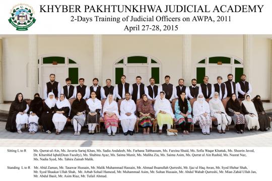 A batch of 25 mix group of civil judges-cum-judicial magistrates participated in a 2 day training here at the Academy. The training was organized in collaboration with the Aurat Foundation Pakistan, Peshawar office. This was the first exclusive training on women rights. The topics of the sessions included ‘an overview of CEDAW’ (by Shabina Ayaz, Aurat Foundation), ‘women rights in Islam’ (by Qazi Ataullah, KPJA), ‘gender concepts’ (by Sherin Javed, Aurat Foundation), ‘women rights: focus on cultural relativism’ (by Dr. Khurshid Iqbal, KPJA), and ‘gender language in Pakistani case law’ (by Maliha Zia, Aurat Foundation). The training concluded on 28th April. Dr. Khurshid Iqbal, Dean of Faculty awarded certificates to the participants.
